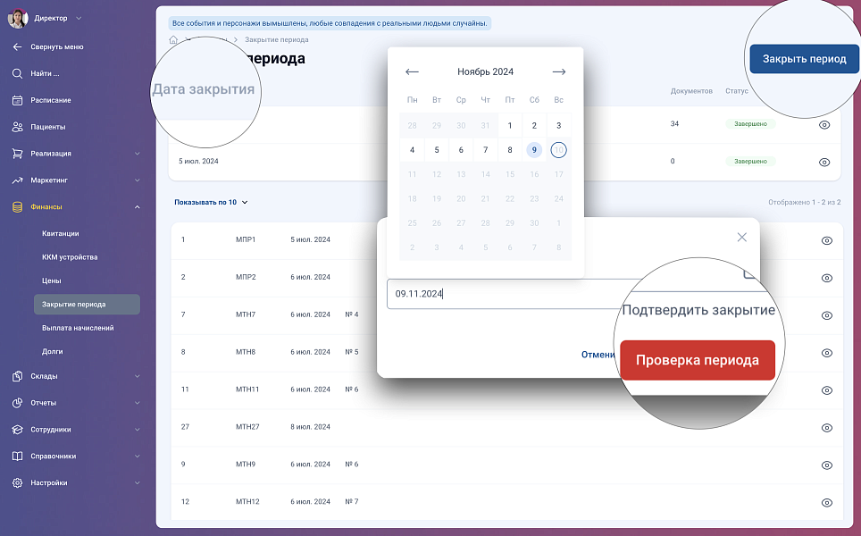 Закрытие периода это очень важное событие в деятельности клиники. После закрытия периода произойдёт перерасчет себестоимости услуг и реализованных товаров, рассчитается сумма начисления сотрудникам. Закрытие периода не позволит сотрудникам изменить проведённые ранее документы.