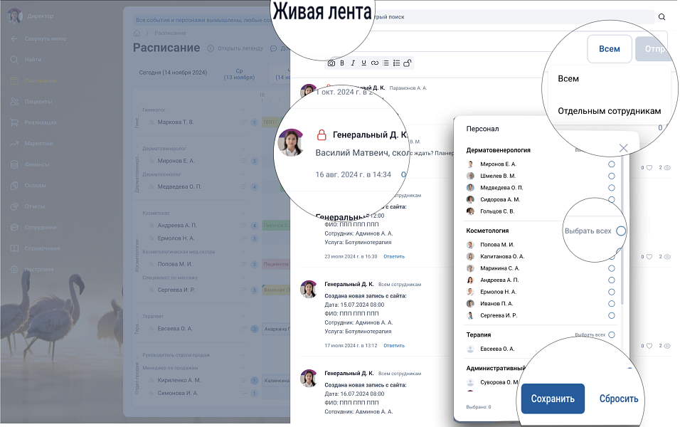 Не уходя из расписание можно осуществить диалог с любым сотрудником или даже со всем коллективом в режиме мессенджера – живая лента.