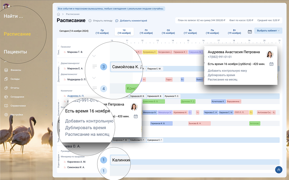 Контрольные явки и возможность сформировать расписание на месяц, дублирование времени записи, когда доктор может принять несколько пациентов в разных кабинетах. Это далеко не все возможности работы с расписанием.