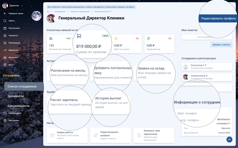 Личное пространство каждого сотрудника организовано в личном кабинете. Здесь собрана вся необходимая информация, в зависимости от должности в клинике. Это и план приемов, динамически меняющийся в связи с актуальностью записи, это и контрольные явки пациентов и заявки на склад, это и расчет заработной платы с историей выплат.